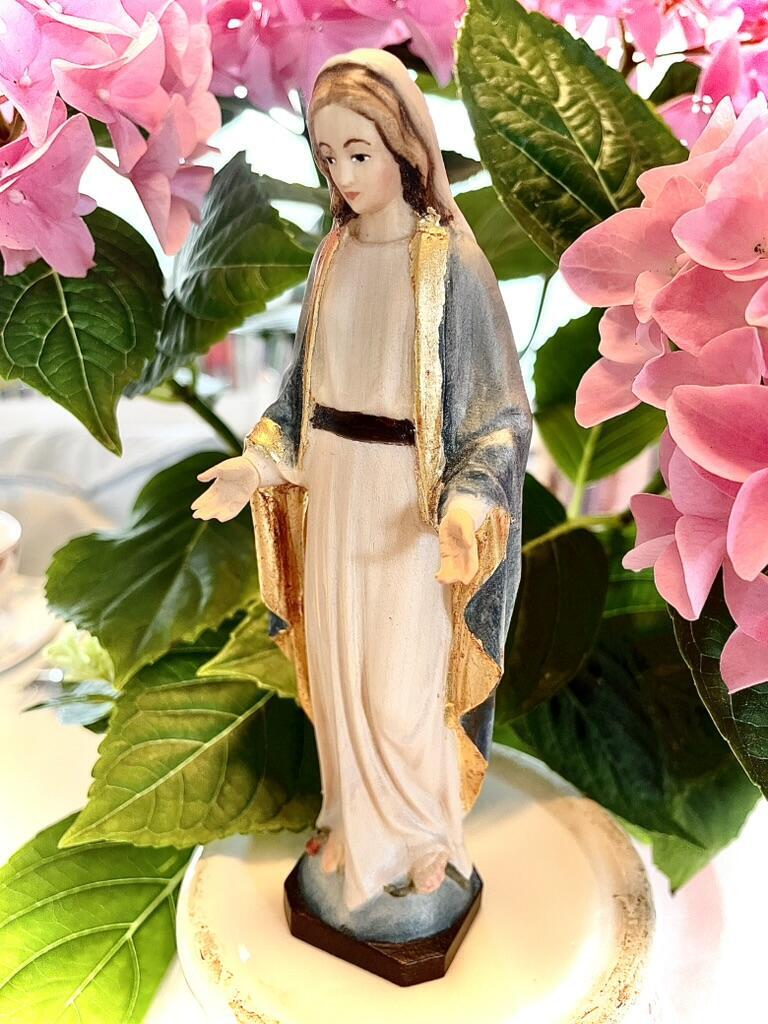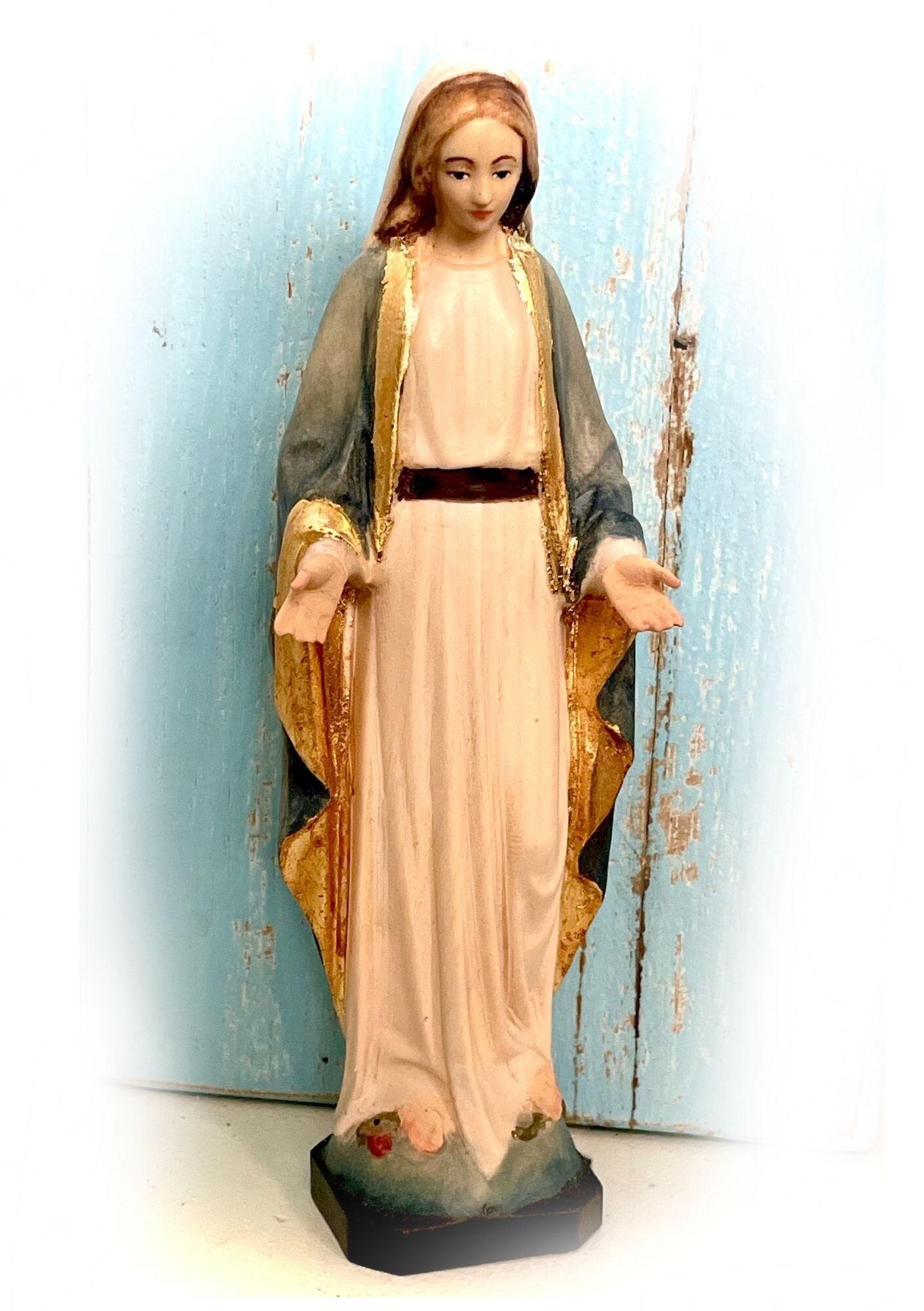 Den smukke Maria, er her håndmalet, så hun står på toppen af Universet og velsigner Verden. Figuren er håndskåret i ahorntræ og herefter håndmalet af de mestre, der leverer figurer til kirker i Italien og hele verden og endda til Vatikanet i Rom. De er kendt for deres smukke håndværk, og dette firma har skåret religiøse træfigurer i mere end 150 år.