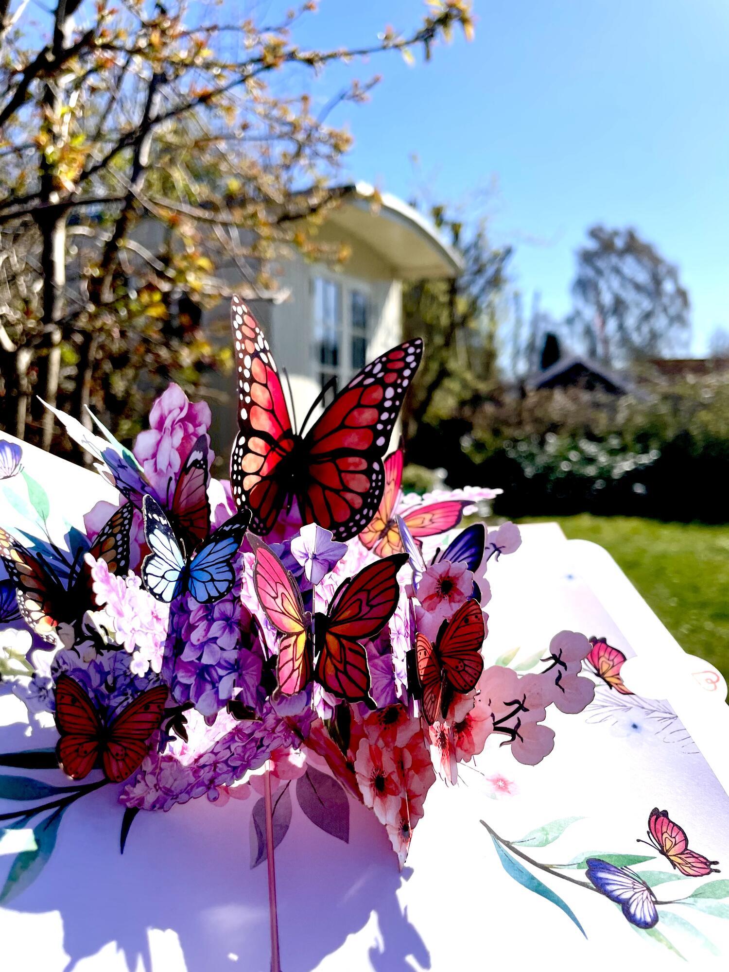 Håndlavet Pop up kort Lyserødt med farverige Sommerfugle 12/17,5 cm foldet + kuvert - fra tysk firma