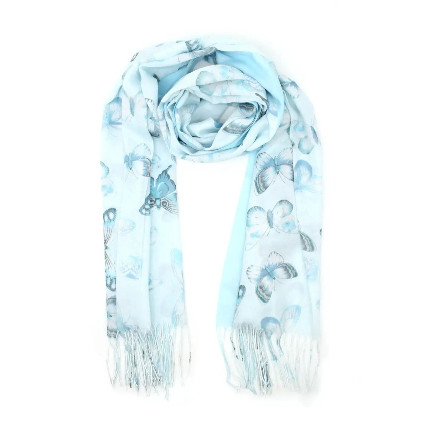 Smukt, langt tørklæde i blød viskose med det fineste sommerfugleprint på forsiden. Bagsiden er lys uden print.