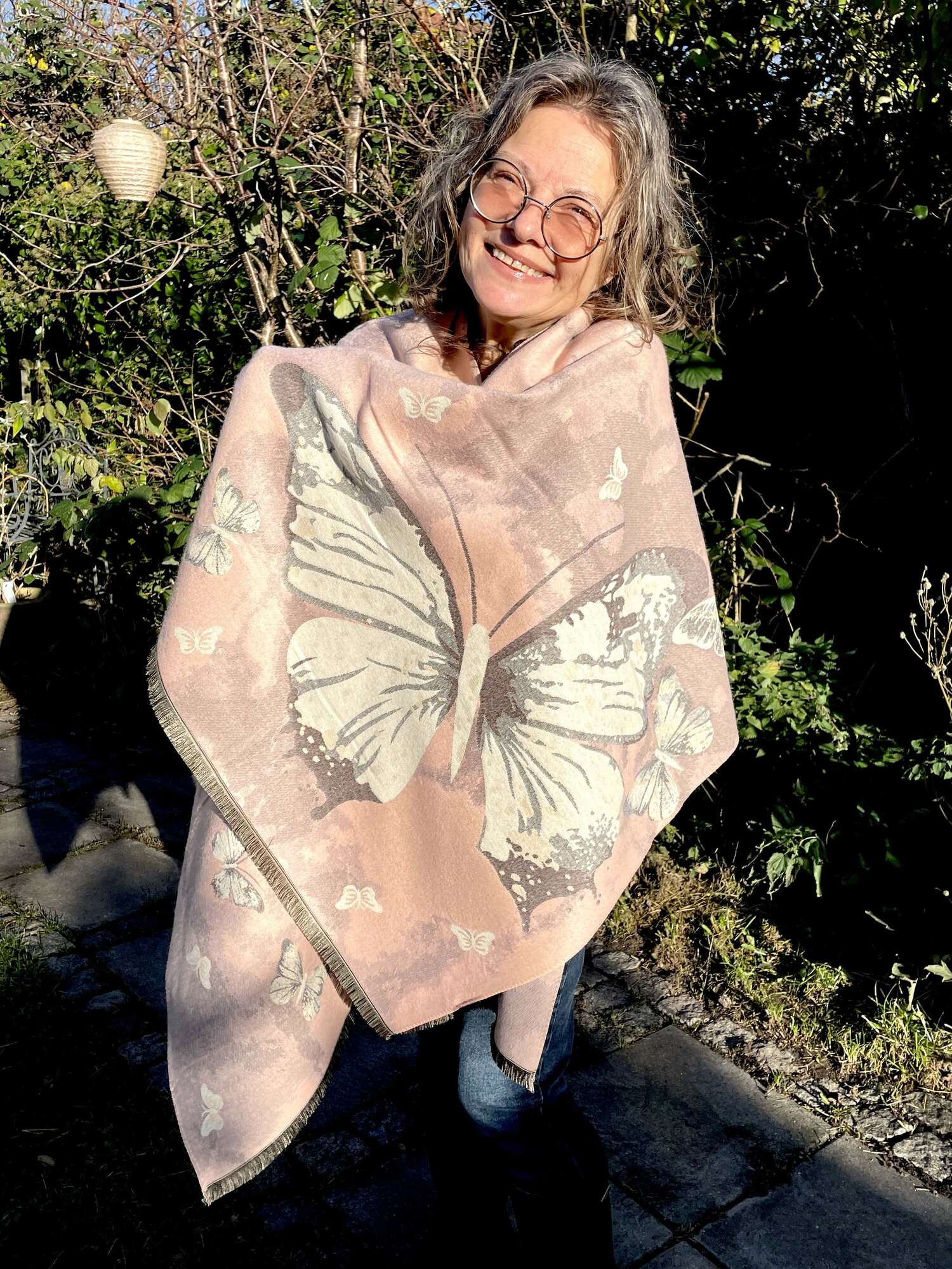 Det smukkeste tykke, bløde sommerfugle-tørklæde til os der elsker sommerfugle og spejler os i sommerfugleprocessen fra larve til puppe til fuldt udviklet sommerfugl.